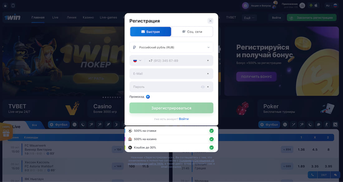 Войти на сайт может каждый, даже не имея регистрации на официальном сайте 1вин. Для гостей доступно изучение функционала ресурса, знакомство с его принципами работы и промо версии некоторых игровых автоматов. Делать ставки на реальные деньги получится только после того, как пользователь зарегистрируется и выполнит вход в личный кабинет. Для того, чтобы зарегистрироваться на официальном сайте, необходимо действовать по следующей инструкции: